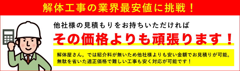 「解体屋さん。」は、お問い合わせからお引き渡しまでワンストップで行っております。下請け業者を雇っていない分、中間マージンなどは発生しないため、業界最安値クラスでご提供できております。また、利益だけを優先するような余分な提案も決してせず、無駄を省いた【適正価格】をお約束しております。